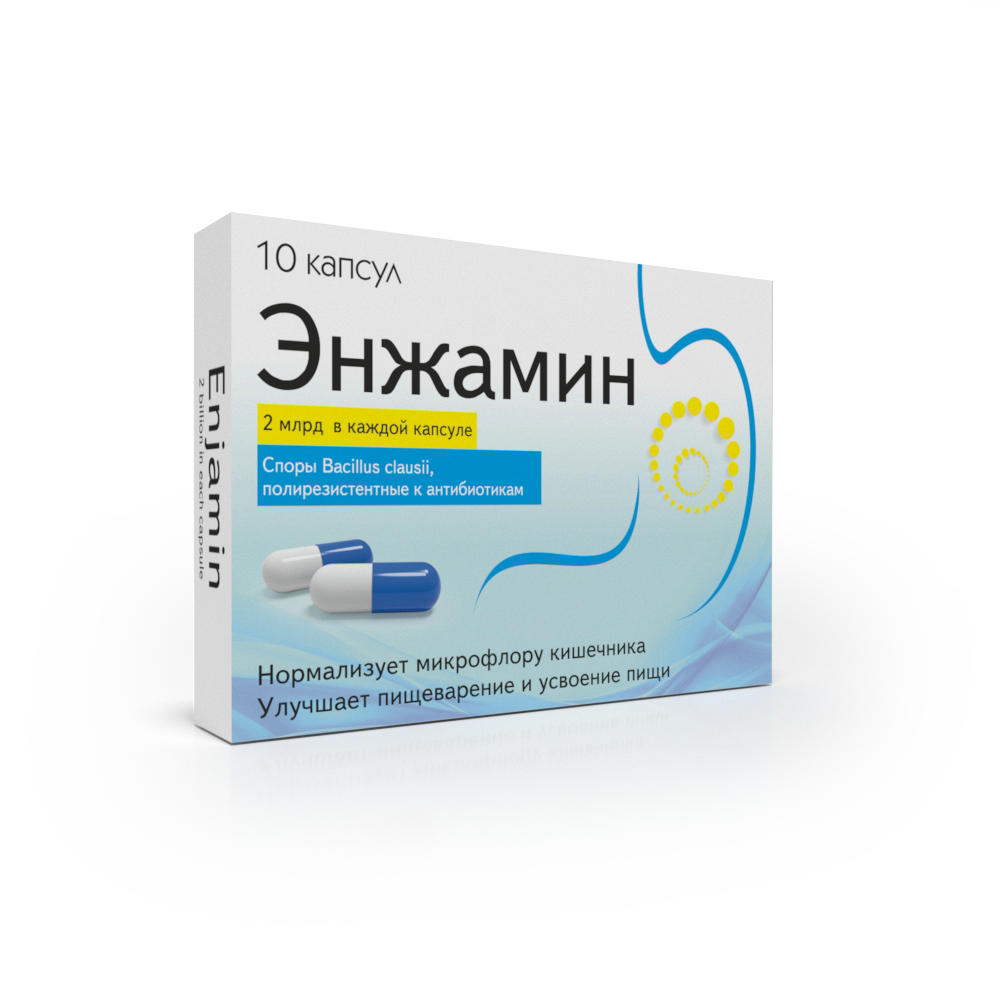 Энжамин – это лекарственный препарат, состоящий из спор Bacillus clausii — нормального обитателя кишечника, лишённого патогенного действия. Преимущество спорообразующих пробиотиков перед неспорообразующими (штаммами Lactobacillus) заключается в том, что они являются термостабильными и могут храниться при комнатной температуре без потери жизнеспособности.